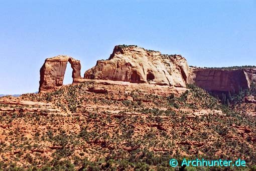 Unweit des Indianerdorfes Cove, in der Navajo Indian Reservation im Nordosten Arizonas, findet man den Royal Arch. Der Zugang ist nur unter indianischer Führung erlaubt. Zum Größenvergleich eine Person in der lichten Öffnung des Arches. Seine Maße: Spannweite: 22,8 m; Lichte Höhe: 51,0 m